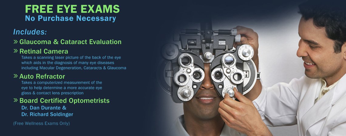- Comprehensive FREE eye exams - Not only do we accept most vision health insurance, but we offer absolutely free eye exams with no purchase necessary. That's right... you can get your eyes tested for $0 when you see Dr. Durante. No strings attached. Just call the optometry clinic or stop by to learn more.